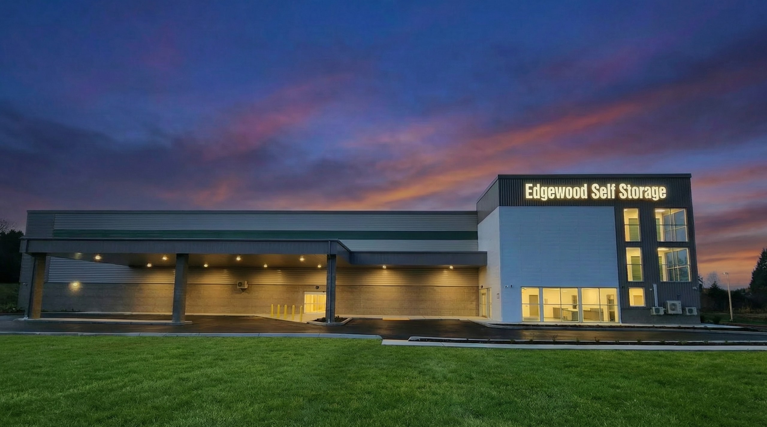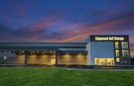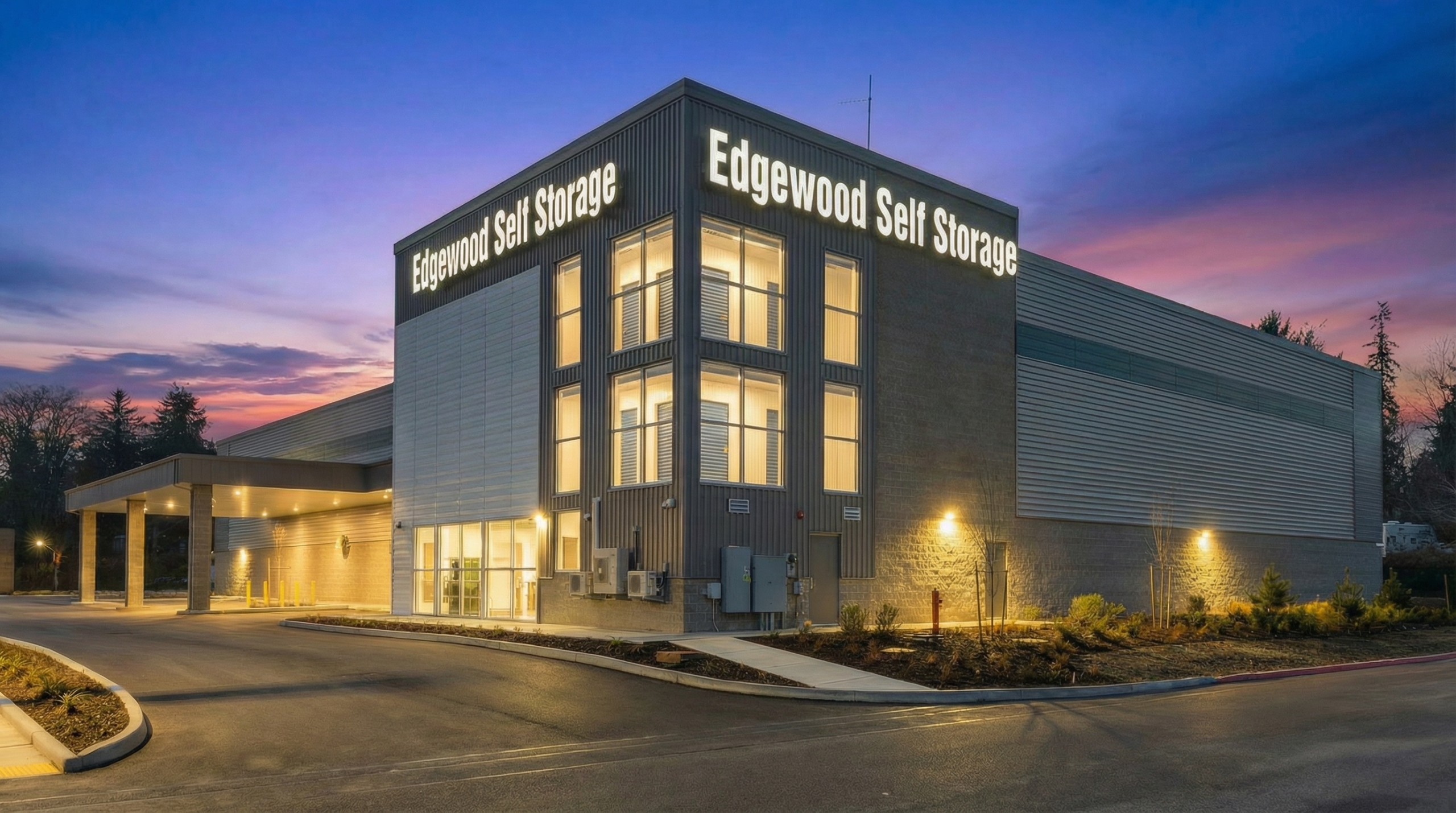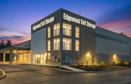 Edgewood Self Storage is a ground-up 3-story, semi-conditioned self-storage facility. The design includes a leasing office and a pull-in loading bay with canopy. The project sits a block off an arterial street, so design features are focused on the northeast corner, to maximize visibility from that street.