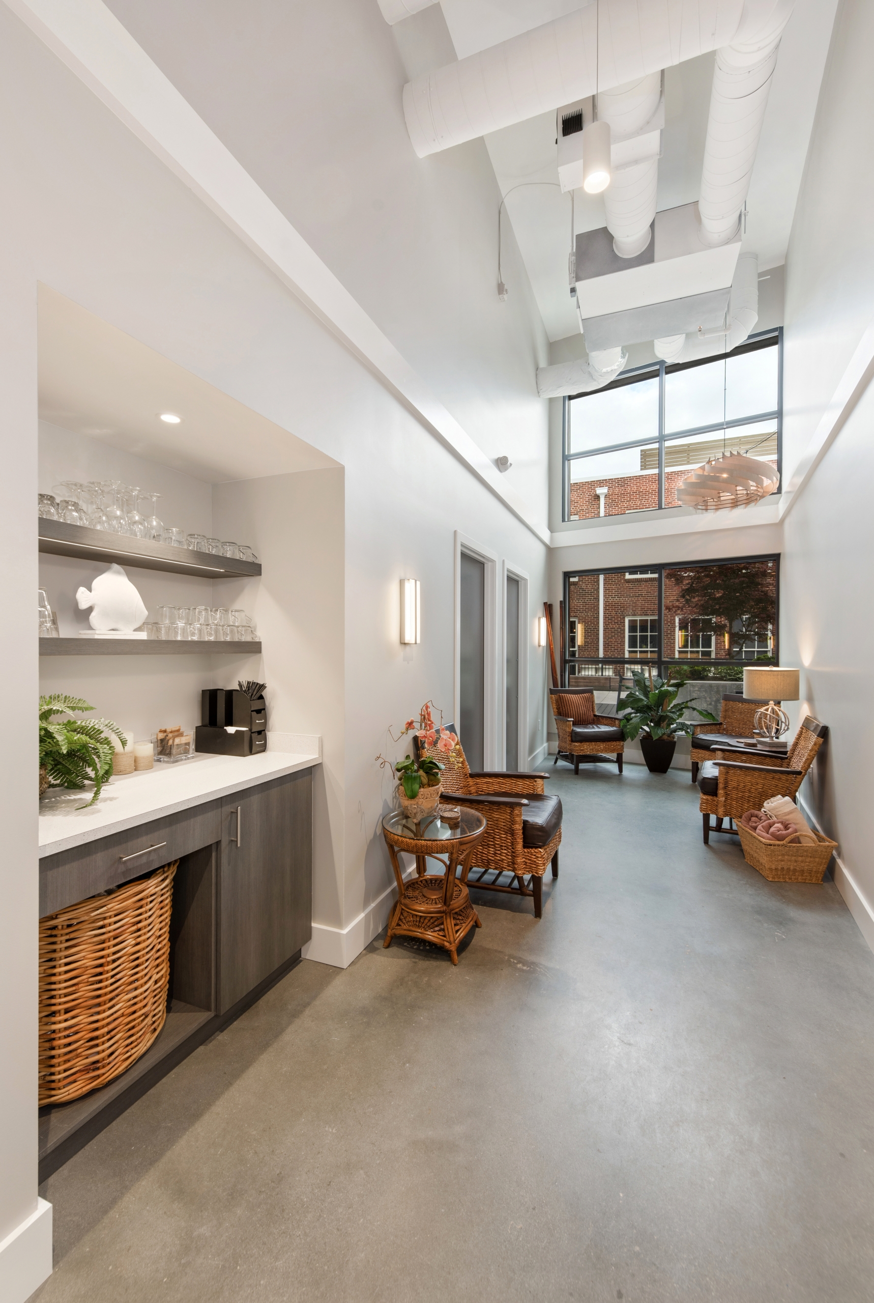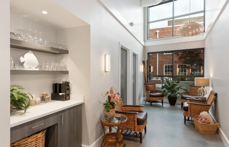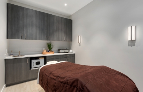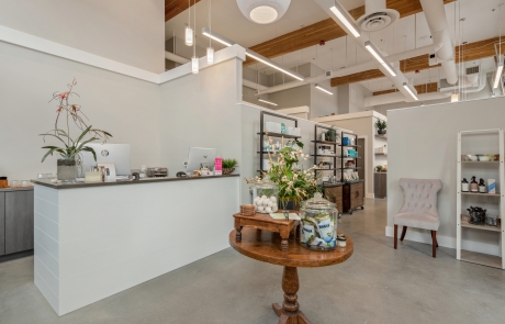 Designed as a serene retreat, this medspa relocation thoughtfully embraces a smaller footprint while enhancing the overall client experience. An open ceiling with exposed wood beams creates a sense of openness and warmth, complemented by abundant natural light that reinforces the spa-like atmosphere. The resulting space balances modern and classic design elements to deliver a calm, welcoming environment rooted in natural materials.